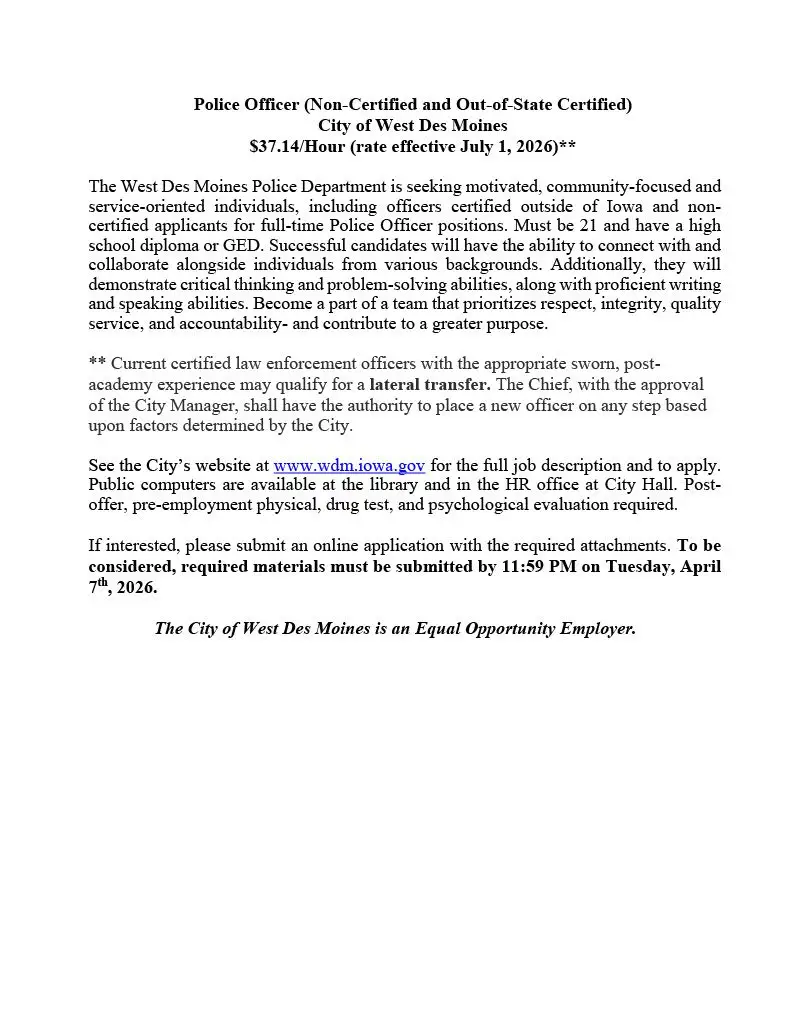 This posting is open to both lateral transfers and individuals who are new to law enforcement and interested in starting a career as a police officer. If hired, the City of Dublin will sponsor non-certified new hires to attend a Basic Peace Officer Training Academy of the City’s choosing. Lateral transfers will need to provide proof of OPOTA certification.